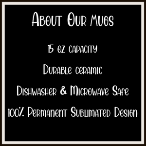 This listing is for 15oz Capacity White Mug with a Sublimated color design